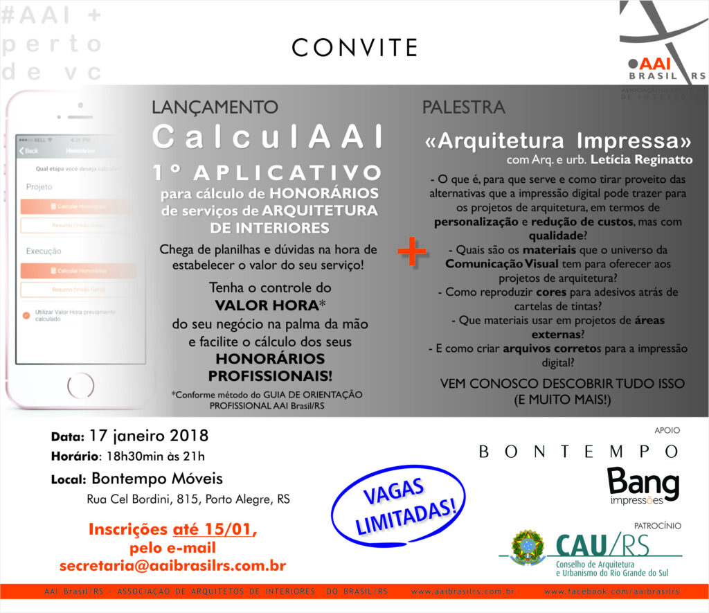 A Associação de Arquitetos de Interiores do Brasil (AAI Brasil/RS) vai lançar um aplicativo para facilitar a vida profissional de arquitetos e urbanistas. O CalculaAAI será apresentado nesta quarta-feira (17/01) e permitirá aos profissionais calcular o Valor Hora e os honorários de projetos ou de execução de projetos de Arquitetura de Interiores.