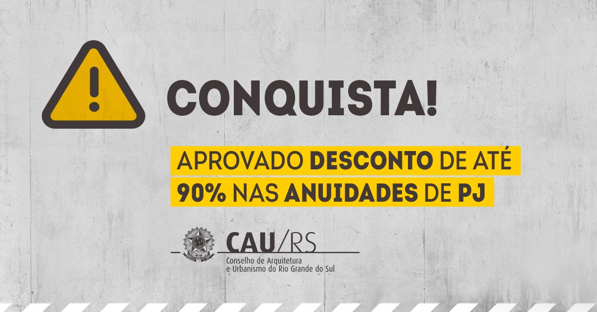 - Além dos descontos previstos, quando do pagamento integral, à vista, da anuidade, será concedido desconto adicional de 90% para Pessoa Jurídica (PJ) ou empresa com um único sócio que seja arquiteto e urbanista;