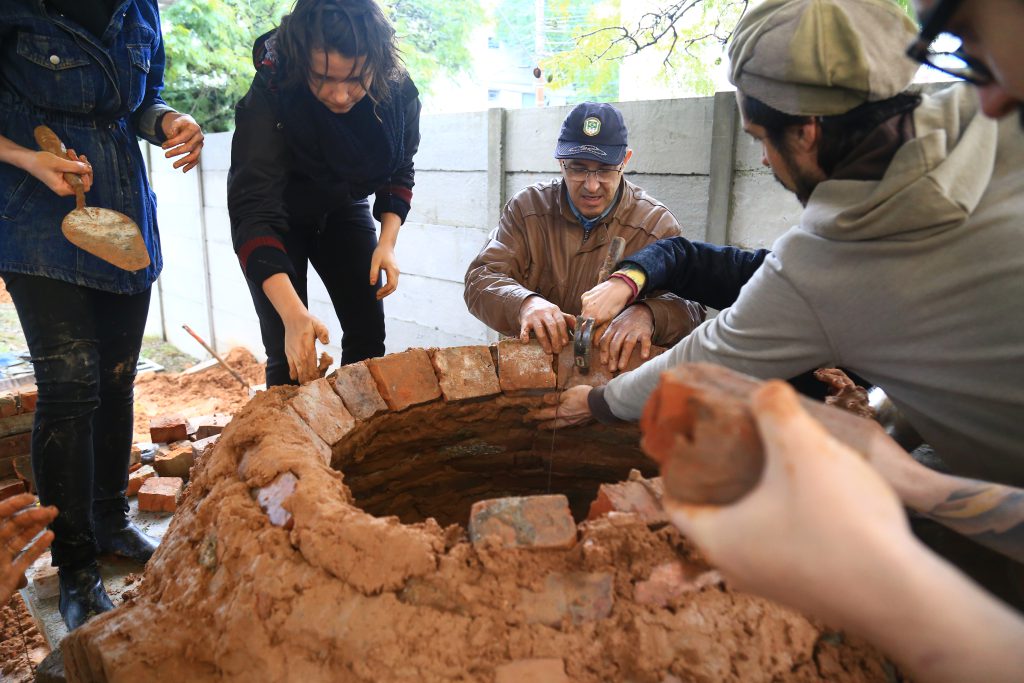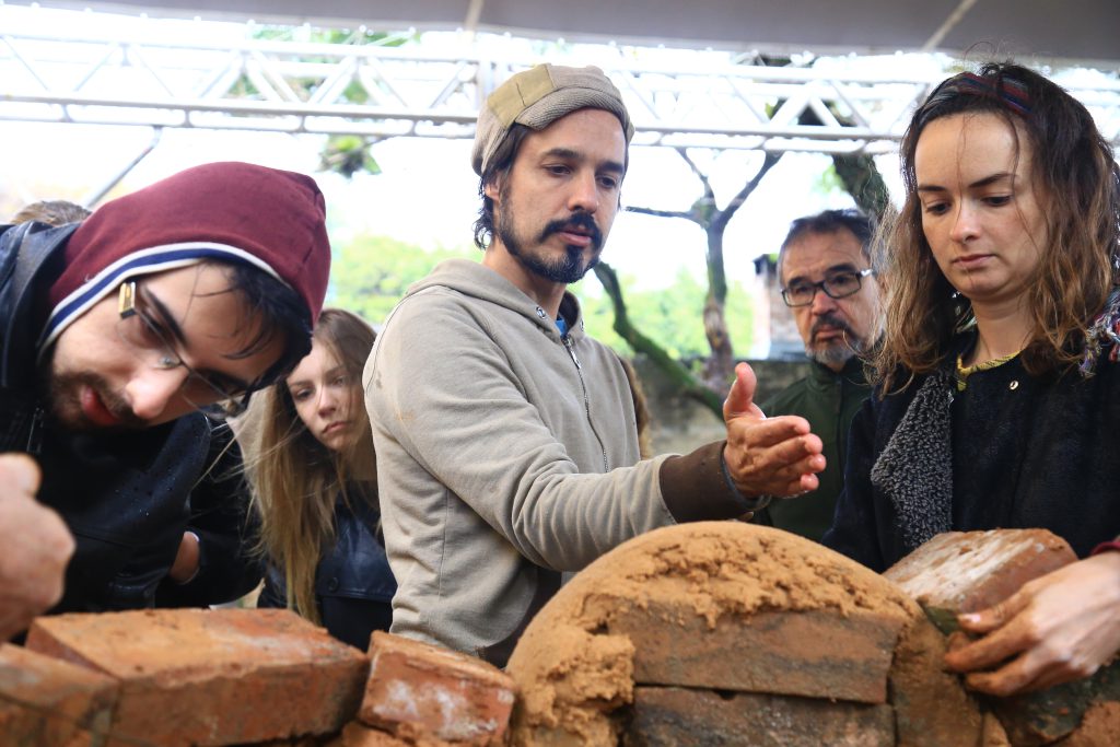 Durante o oficina, profissionais e estudantes de várias partes do Rio Grande do Sul colocaram a mão na massa para confeccionar um forno de pizza de tijolos de demolição e terra crua, seguindo as premissas da permacultura. A proposta consiste em construir usando apenas elementos naturais e reaproveitados. Após a construção e reboco no forno, chegou a hora do grande teste. Tomaz Lotufo dedicou-se então a ensinar habilidades gastronômicas na produção de pizzas que, assadas no próprio forno, foram degustadas no início da noite em evento também na sede do Saergs. “A arquitetura envolve afeto e o ato de construir junto cria laços”, pontuou o palestrante, que defende um aprendizado diferente do que comumente se faz, como em um sistema bancário, onde o conhecimento é apenas “um depósito de conteúdo”.