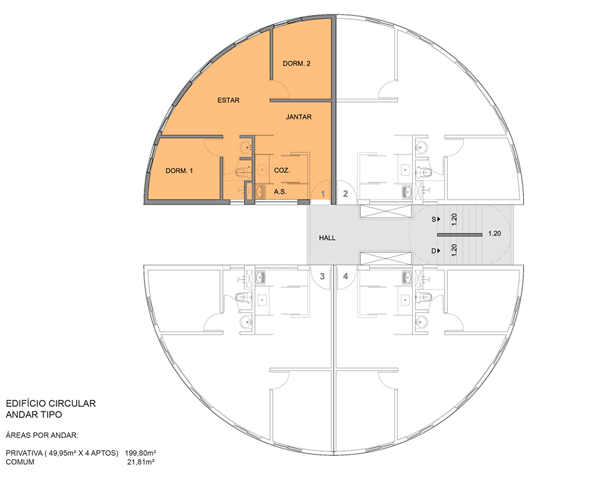 A escolha da forma cilíndrica, que se tornou um marco dos edifícios, não foi meramente estética. “No redondo, primeiro, se eu tenho dois prédios, não encostam um no outro, precisa deixar separado. Ao separar, eu dou dignidade para os quatro apartamentos: sol direto, ventilação direta etc. E na sala, eu consigo por três janelas, uma luz bem boa”.