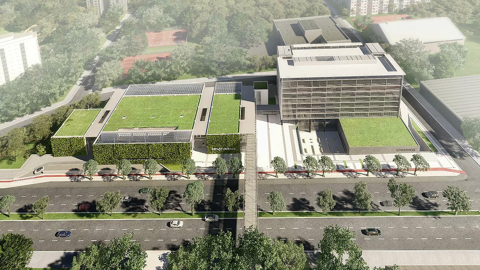 O novo campus da Unisinos é um complexo arquitetônico projetado para otimizar o uso de energia. Mauricio Ceolin, arquiteto e urbanista da at-arquitetura, responsável pelo projeto, conta que o escritório buscou recuperar a área verde do entorno da obra de uma maneira contemporânea. “Havia naquela região da Av. Nilo Peçanha um campo de futebol e uma linha de vegetação que criava uma massa verde. Um dos desafios do projeto foi preservar a memória que as pessoas tinham daquele trecho”, destaca. Com isso, a fachada do prédio que pode ser observado das salas de aula do colégio Anchieta, localizado em frente ao campus, tem a mesma altura da antiga vegetação.