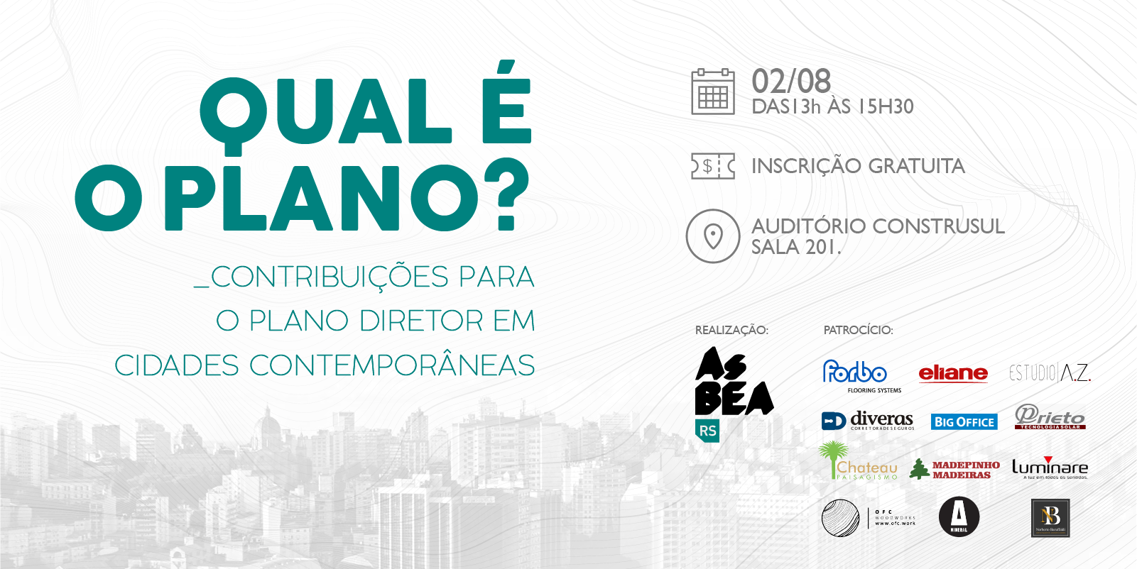 No dia 2 de agosto, a Associação Brasileira dos Escritórios de Arquitetura (AsBEA-RS) promove o painel “Qual é o Plano? Contribuições para o Plano Diretor em cidades contemporâneas”. O evento faz parte da programação da Feira Construsul, realizada no Centro de Eventos da FIERGS (Av. Assis Brasil, 8787 – Porto Alegre/RS).