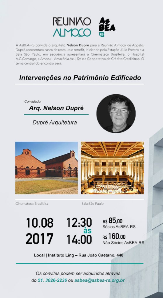 A próxima edição da tradicional Reunião Almoço da Associação Brasileira de Escritórios de Arquitetura e Urbanismo (AsBEA-RS) convida o arquiteto e urbanista Nelson Dupré, da Dupré Arquitetura, para apresentar trabalhos de restauro e retrofit.