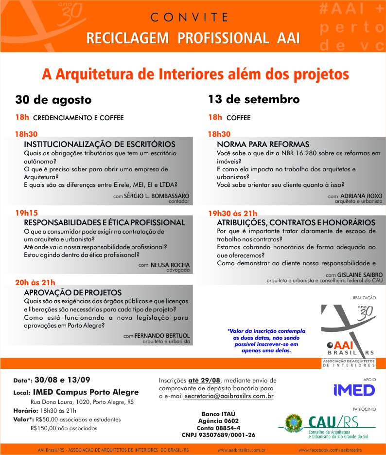 A Associação de Arquitetos de Interiores (AAI) promove dias 30 de agosto e 13 de setembro capacitação para profissionais na IMED em Porto Alegre (Rua Dona Laura, 1020), das 18h30 às 21h. É a arquitetura de interiores além do projeto.