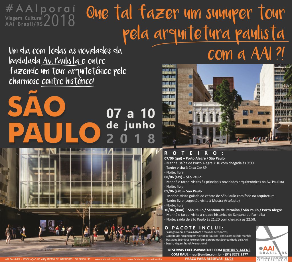 Que tal fazer um tour arquitetônico por São Paulo? Essa é a proposta da Viagem Cultural da Associação de Arquitetos de Interiores (AAI Brasil/RS). O roteiro percorrerá, de 07 a 10 de junho: