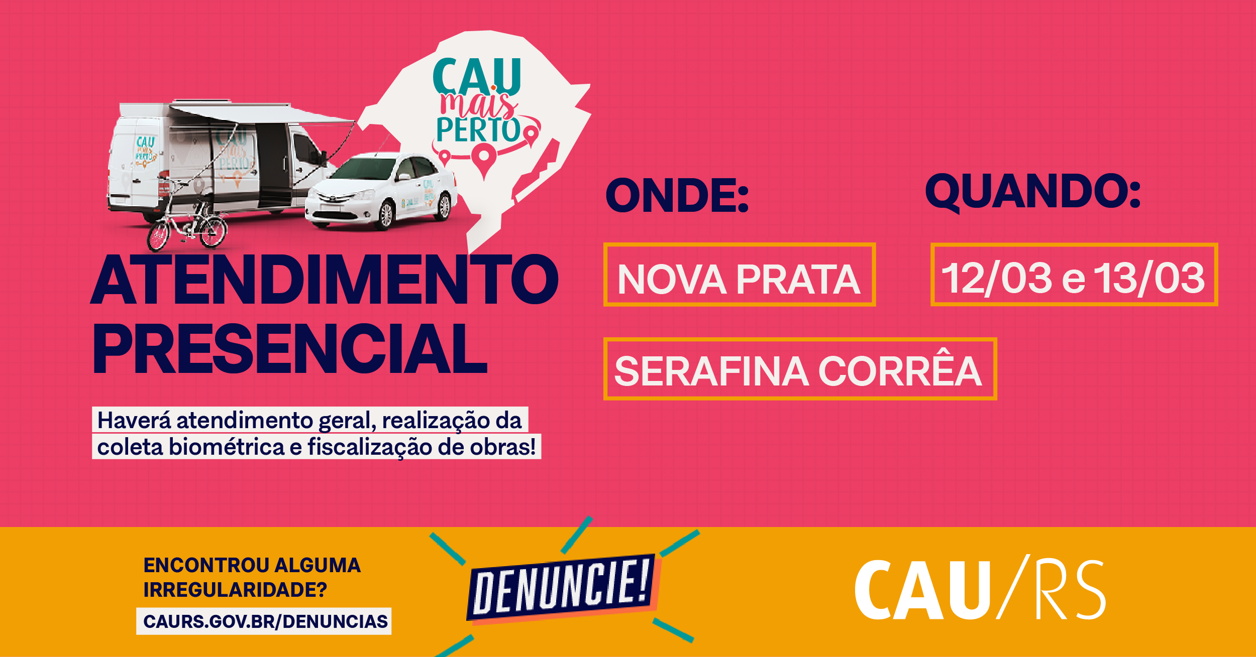 O CAU Mais Perto, programa itinerante do Conselho de Arquitetura e Urbanismo (CAU/RS), realiza atendimentos presenciais com o furgão na próxima semana em Nova Prata e Serafina Corrêa. Confira a seguir os horários e o local de atendimento, que inclui coleta biométrica para emissão da Carteira Profissional.
