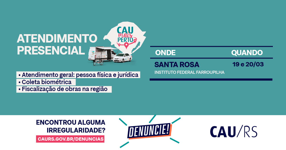 A equipe do CAU Mais Perto, programa itinerante do Conselho de Arquitetura e Urbanismo (CAU/RS), estará em Santa Rosa nos dias 19 e 20 de março. Confira a seguir o cronograma de atendimento, que inclui coleta biométrica para emissão da Carteira Profissional.