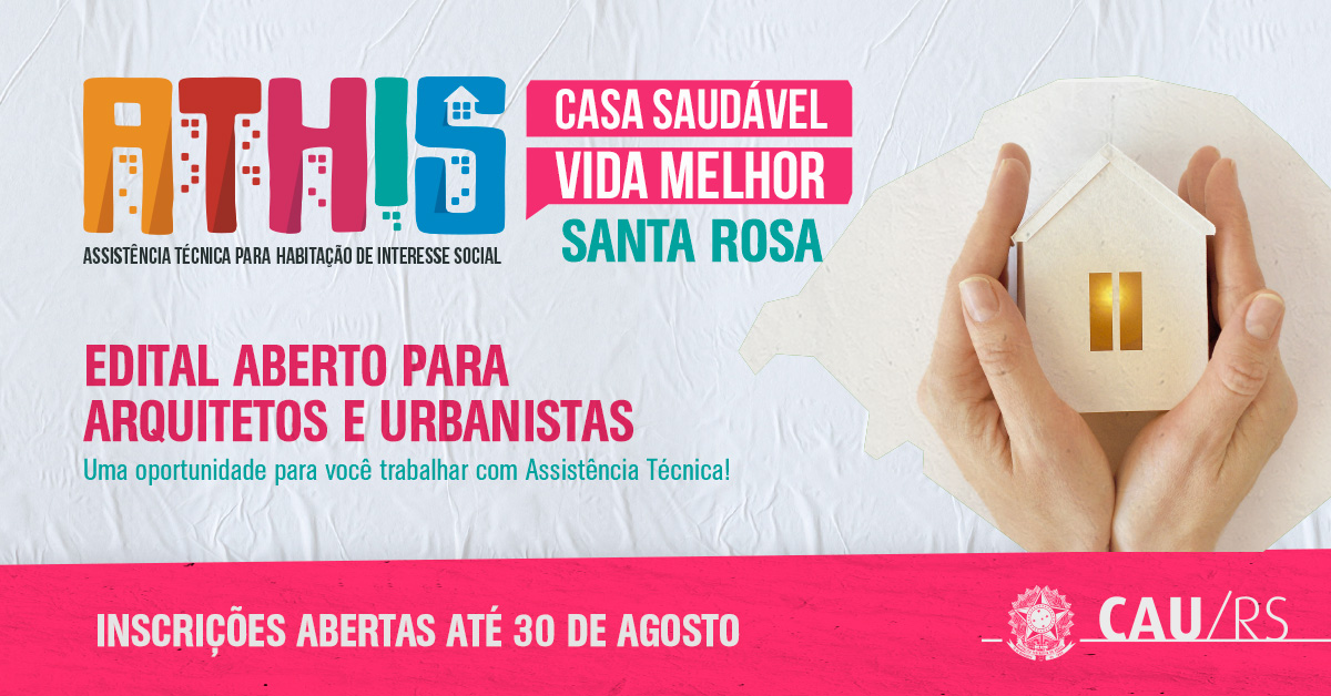 Os profissionais selecionados atuarão em caráter temporário, para trabalhos de projeto, acompanhamento e execução de obras necessários para melhorias habitacionais no município de Santa Rosa. Eles serão auxiliados pelo Gabinete de ATHIS do CAU/RS e pela Coordenadoria Local do Programa ATHIS Casa Saudável, a cargo da APEA.SR. As inscrições estão abertas até 30 de agosto e devem ser feitas pelo SICCAU (clique aqui e veja o passo a passo).