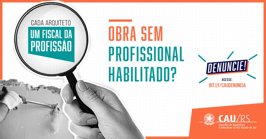 Um Conselho forte se faz com a participação de todos. Por isso, o Conselho de Arquitetura e Urbanismo (CAU/RS) lança a campanha “Cada arquiteto um fiscal da profissão”, que incentiva a realização de denúncias por parte da população e dos arquitetos e urbanistas.