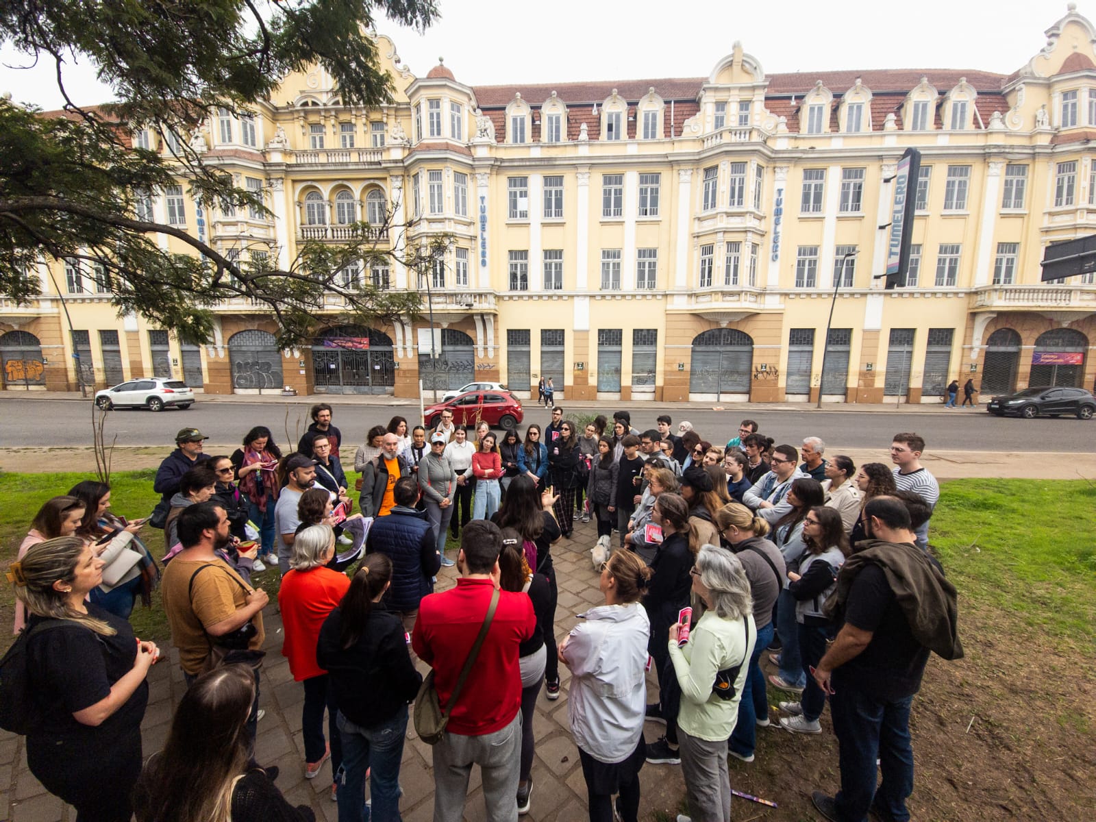Guiados pelos arquitetos e urbanistas José Daniel Simões e Lucas Volpatto, integrantes do Conselho Consultivo do Centro de Memória CAU/RS, o público percorreu o trajeto que liga 19 edificações históricas da capital. Saindo do Edifício Ely (prédio do Tumelero), o grupo fez paradas para acompanhar as reflexões a respeito da história e da arquitetura de edificações como o Edifício Renner, a Galeria Chaves, a Livraria do Globo, o Força e Luz, a Federação, onde hoje funciona o Museu da Comunicação Hipólito José da Costa, e, por último, o Hotel Majestic – a Casa de Cultura Mário Quintana. Durante o trajeto, as explicações despertavam a curiosidade dos pedestres que circulavam pelo centro da capital na manhã de domingo.