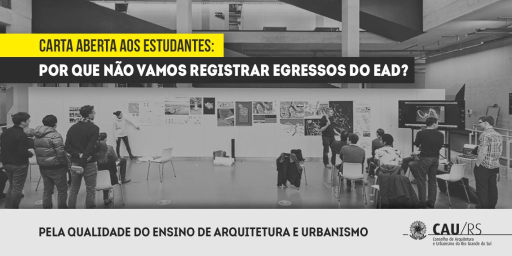 Motivado por diversas denúncias e preocupado com recentes distorções introduzidas de maneira equivocada no ensino de nossa profissão, o Conselho de Arquitetura e Urbanismo (CAU/RS) deliberou que não aceitará o registro de profissionais formados em cursos na denominada modalidade de ensino à distância (EaD). O CAU/RS entende que o EaD é uma ferramenta excelente, que incorpora as novas tecnologias, amplia e potencializa novas possibilidades de ensino. Entretanto, o EaD não é uma “modalidade” que possa ocorrer em paralelo com o ensino presencial, muito menos em substituição a este, com claríssimas perdas de qualidade e diversidade e danos irreparáveis à formação dos futuros profissionais.