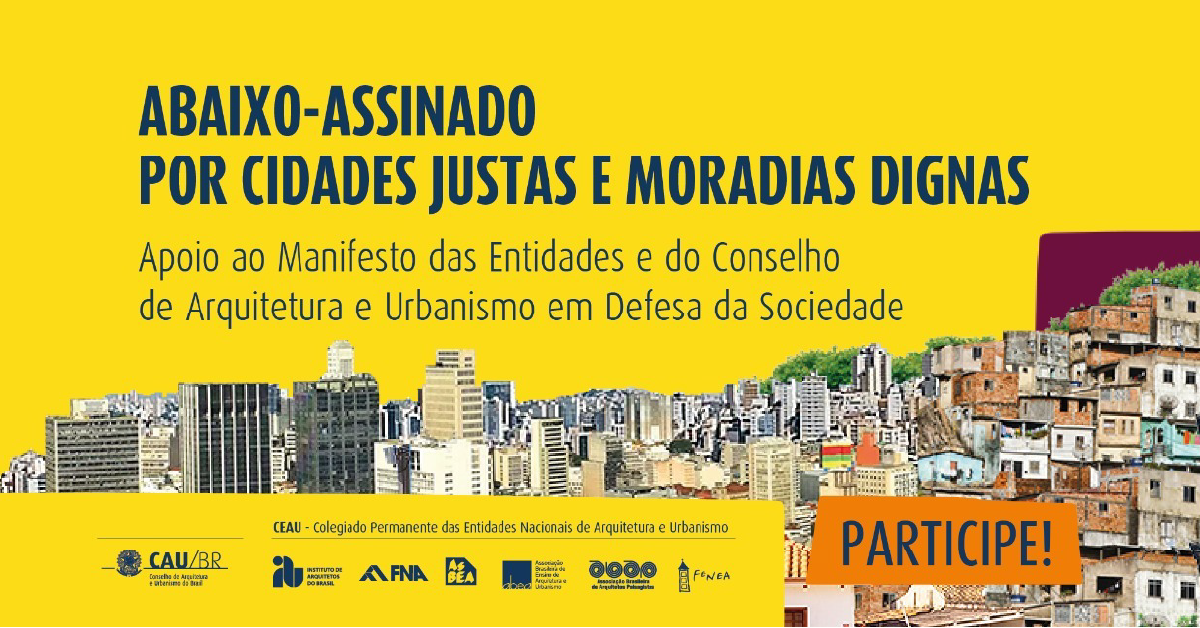 Está disponível o “Abaixo-Assinado Por Cidades Justas e Moradias Dignas”, em apoio às propostas do manifesto “O Brasil precisa de Mais Arquitetura e Urbanismo”, a Carta Aberta às Candidatas e aos Candidatos nas Eleições de 2022, lançada pelo CAU Brasil e pelas entidades do CEAU (IAB, FNA, ABEA, AsBEA, ABAP e FeNEA) em ato público realizado em São Paulo em maio de 2022. Clique aqui para acessar e assinar. Compartilhe! Abaixo, leia o documento na íntegra.