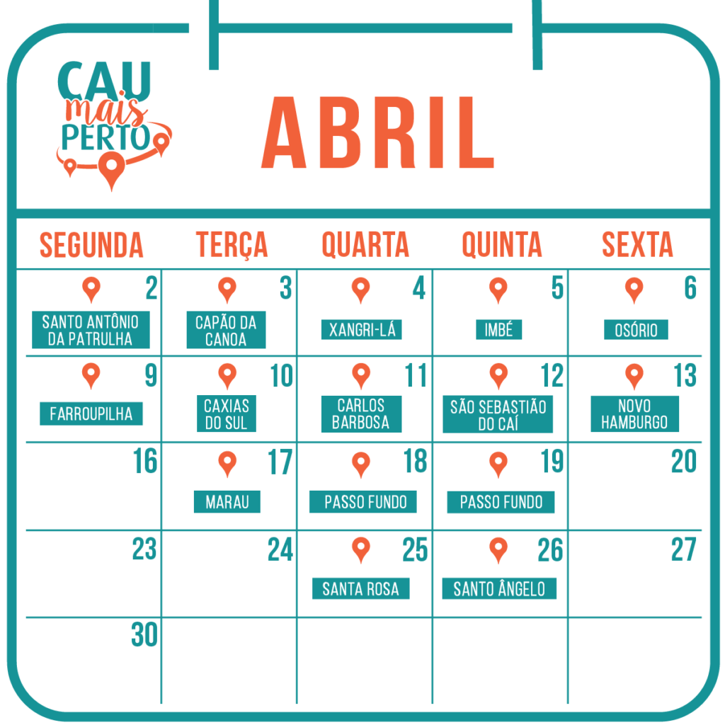 Após percorrer algumas cidades do litoral, o CAU Mais Perto irá para a Serra Gaúcha e Região Metropolitana de Porto Alegre de 09 a 13 de abril. Farroupilha, Caxias do Sul, Carlos Barbosa, São Sebastião do Caí e Novo Hamburgo estão na rota de viagens do programa de atendimento aos profissionais do Conselho de Arquitetura e Urbanismo (CAU/RS).