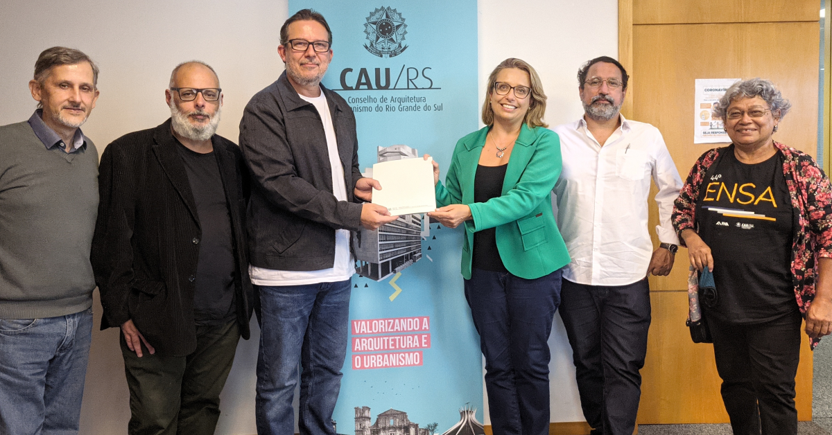 Na ocasião, estavam reunidos o presidente do Conselho, Tiago Holzmann da Silva; o Chefe de Gabinete e coordenador do projeto pelo CAU/RS, Paulo Henrique Soares, e o presidente do Sindicato dos Arquitetos no Estado Rio Grande do Sul (Saergs), Evandro Medeiros. Representando a FNA, estavam a presidente Eleonora Mascia; o secretário de Organização e Formação Sindical da Federação, Danilo Matoso e a secretária de Relações Trabalhistas, Danya Silva.