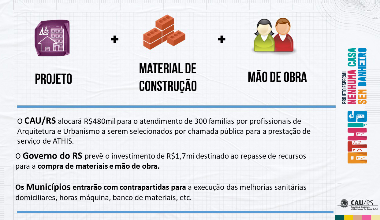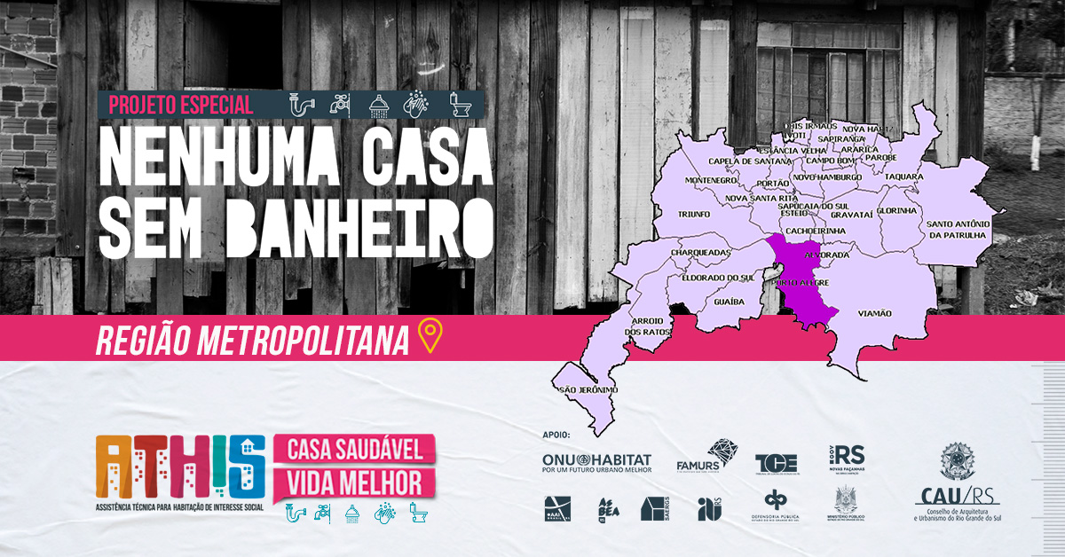 Apoiado na Lei de Assistência Técnica para Habitação de Interesse Social (Lei nº 11.888/2008), o projeto especial Nenhuma Casa sem Banheiro faz parte de um conjunto de iniciativas de combate à COVID-19 lançadas pelo CAU/RS em 2020. O objetivo é viabilizar a promoção de melhorias sanitárias domiciliares a famílias de baixa renda; a expectativa é beneficiar cerca de 11 mil famílias gaúchas.