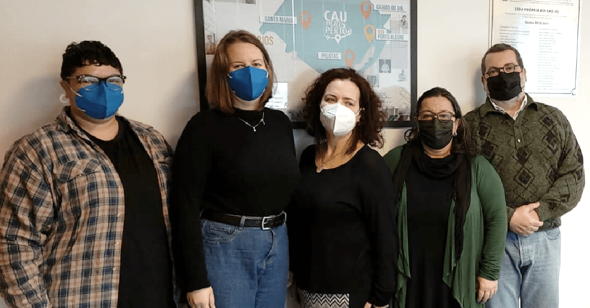 Na última sexta-feira (05), o Conselho de Arquitetura e Urbanismo (CAU/RS) sediou a primeira reunião presencial da vice-presidência de Equidade Racial e de Gênero do Fórum dos Conselhos e Ordens das Profissões Regulamentadas do Estado do Rio Grande do Sul. Além da conselheira Carline Carazzo, participaram também o integrante do Grupo de Trabalho de Gênero do CAU/RS Mar Acosta; o Assessor de Relações Institucionais e Governamentais, Fausto Leiria; Ana Luiza de Souza Castro, presidente do Conselho Regional de Psicologia (CRP/RS), e Rosangela Gomes Schneider, presidente do Conselho Regional de Enfermagem (Coren-RS).