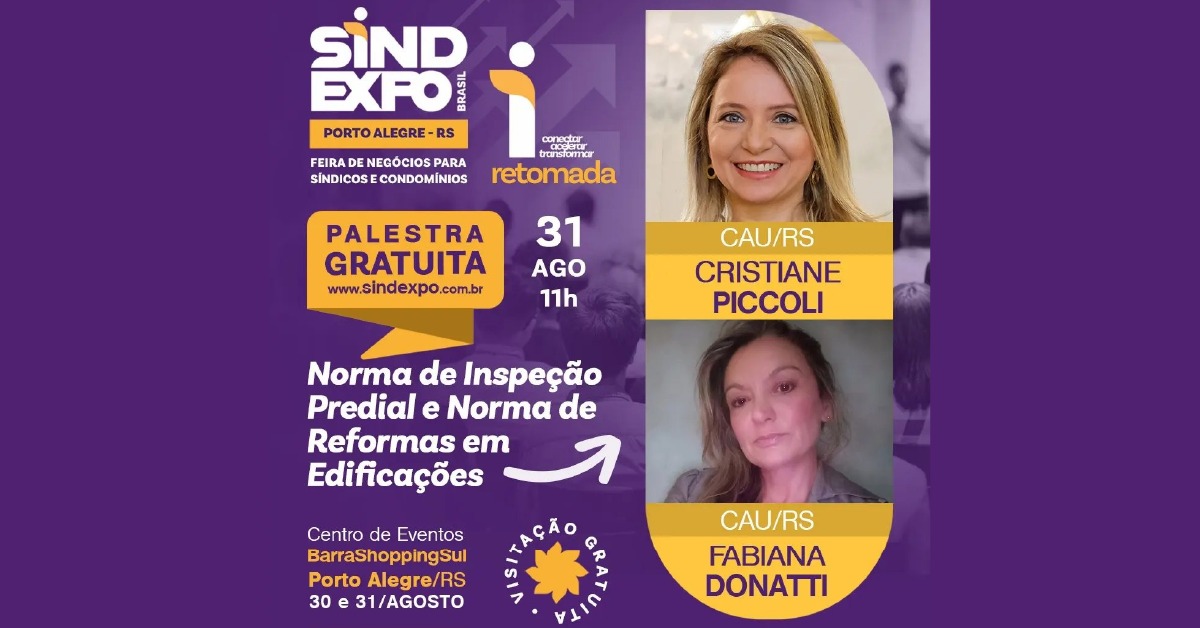 No dia 31 de agosto, as conselheiras do Conselho de Arquitetura e Urbanismo do Rio Grande do Sul (CAU/RS) Cristiane Bisch Piccoli e Fabiana Donatti estarão na maior feira de negócios para Síndicos e Condomínios do Brasil, a SindExpo 2024 Porto Alegre.