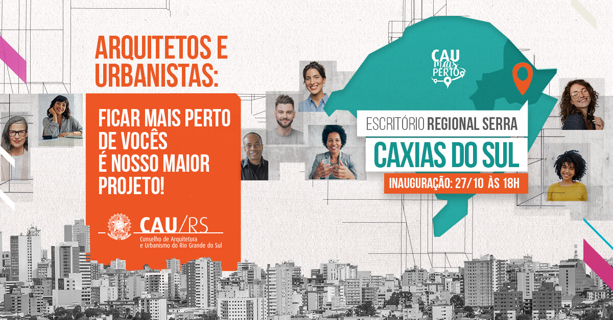 No próximo dia 27, às 18h, o Conselho de Arquitetura e Urbanismo (CAU/RS) inaugura o Escritório Regional Serra, localizado em Caxias do Sul, na Rua Os Dezoito do Forte, 1639, sala 110, no Centro da cidade.