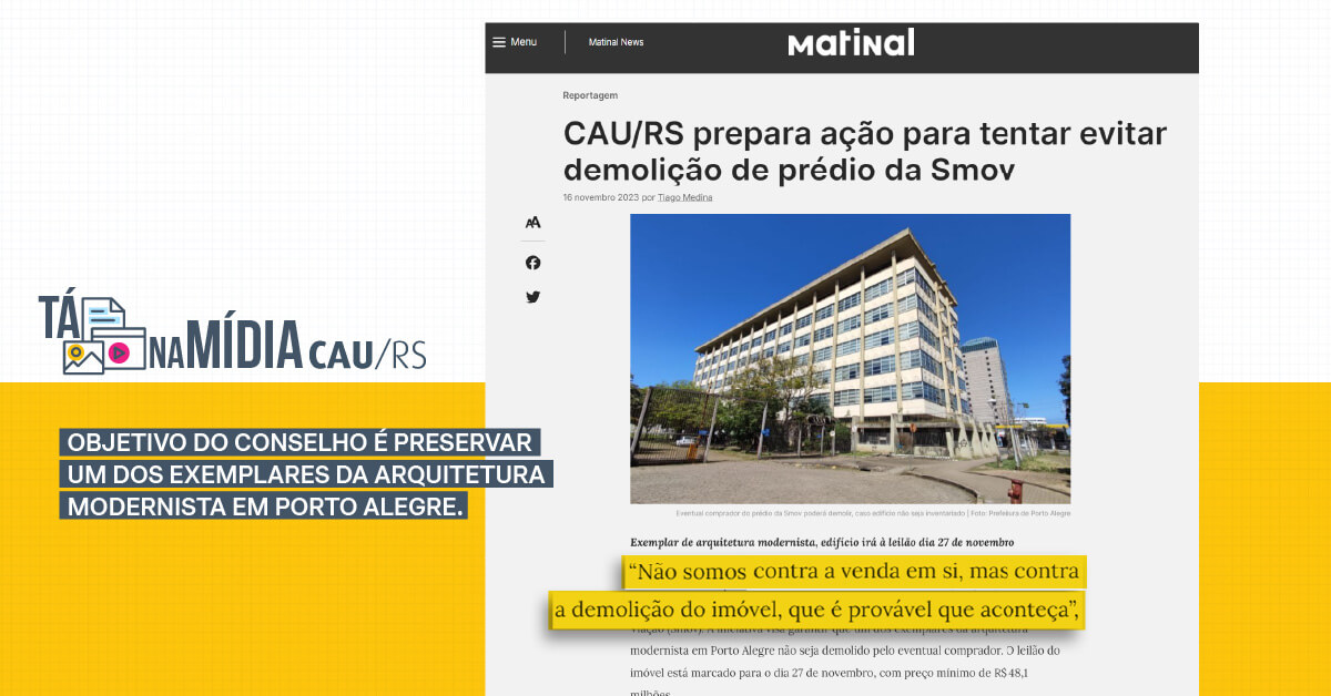A newsletter Matinal, que reúne as principais notícias do Rio Grande do Sul, divulgou nesta quinta-feira (16/11) uma matéria sobre a ação do Conselho de Arquitetura e Urbanismo (CAU/RS) para evitar a demolição do prédio onde funcionava a antiga Secretaria Municipal de Obras e Viação (Smov).