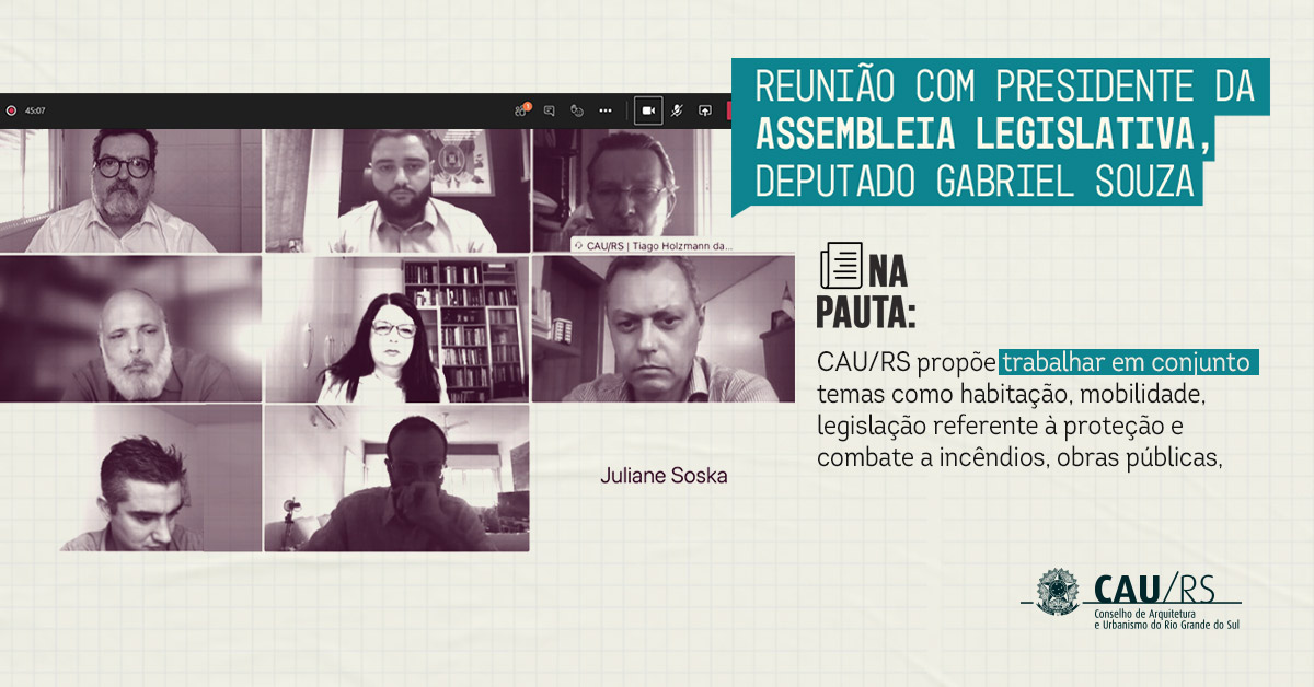 Nesta segunda-feira (08), o presidente do CAU/RS participou de uma reunião virtual com o presidente da Assembleia Legislativa do Rio Grande do Sul, deputado Gabriel Souza. A reunião foi um convite do Conselho gaúcho para fortalecer os laços de cooperação institucional, uma vez que a Assembleia é a encarregada de fazer as leis estaduais.