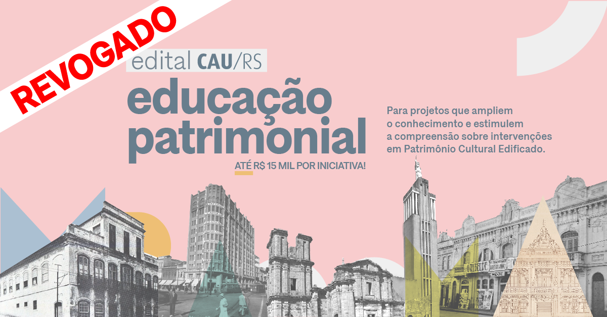 O Conselho de Arquitetura e Urbanismo (CAU/RS) revogou o edital de Educação Patrimonial. A fim de aprimorar os procedimentos internos e externos relacionados a parcerias com as organizações civis a bem do interesse público, a decisão foi publicada na Portaria Presidencial nº 26/2024.