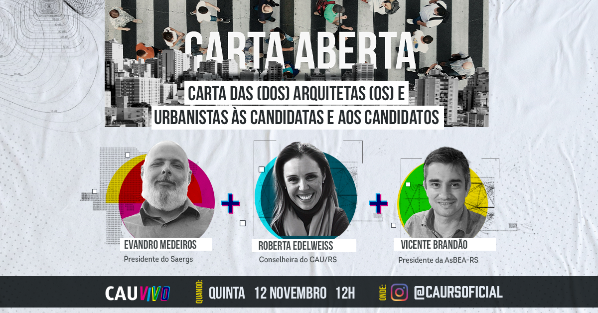 A 28ª edição do projeto acontece nesta quinta-feira (12/11). A conselheira do CAU/RS, Roberta Edelweiss, conversa com o presidente do Sindicato dos Arquitetos no Estado Rio Grande do Sul (Saergs), Evandro Babu Medeiros, e o presidente da Associação Brasileira dos Escritórios de Arquitetura (AsBEA-RS), Vicente Brandão, sobre a Carta das (dos) arquitetas(os) e urbanistas às candidatas e aos candidatos.