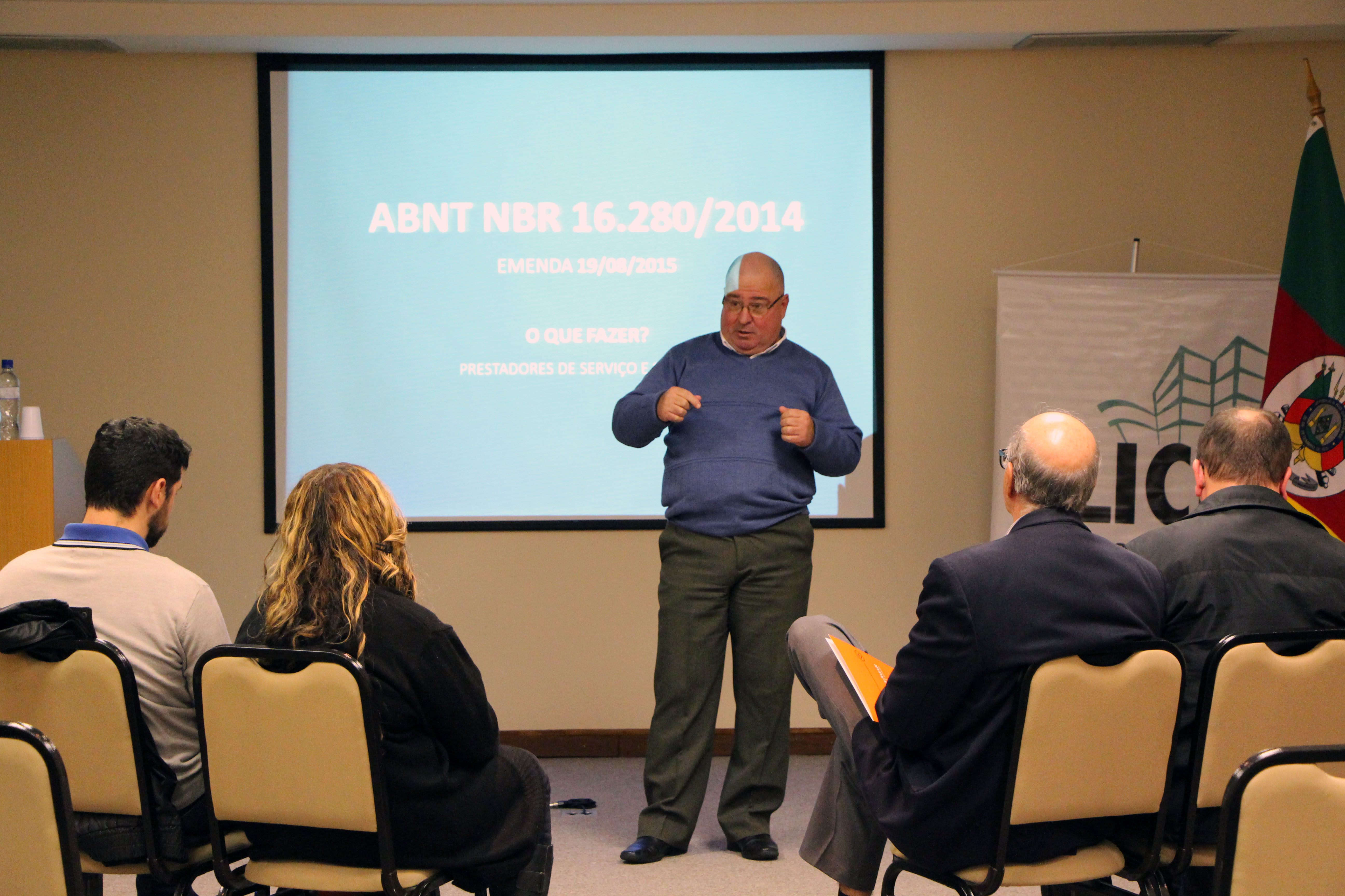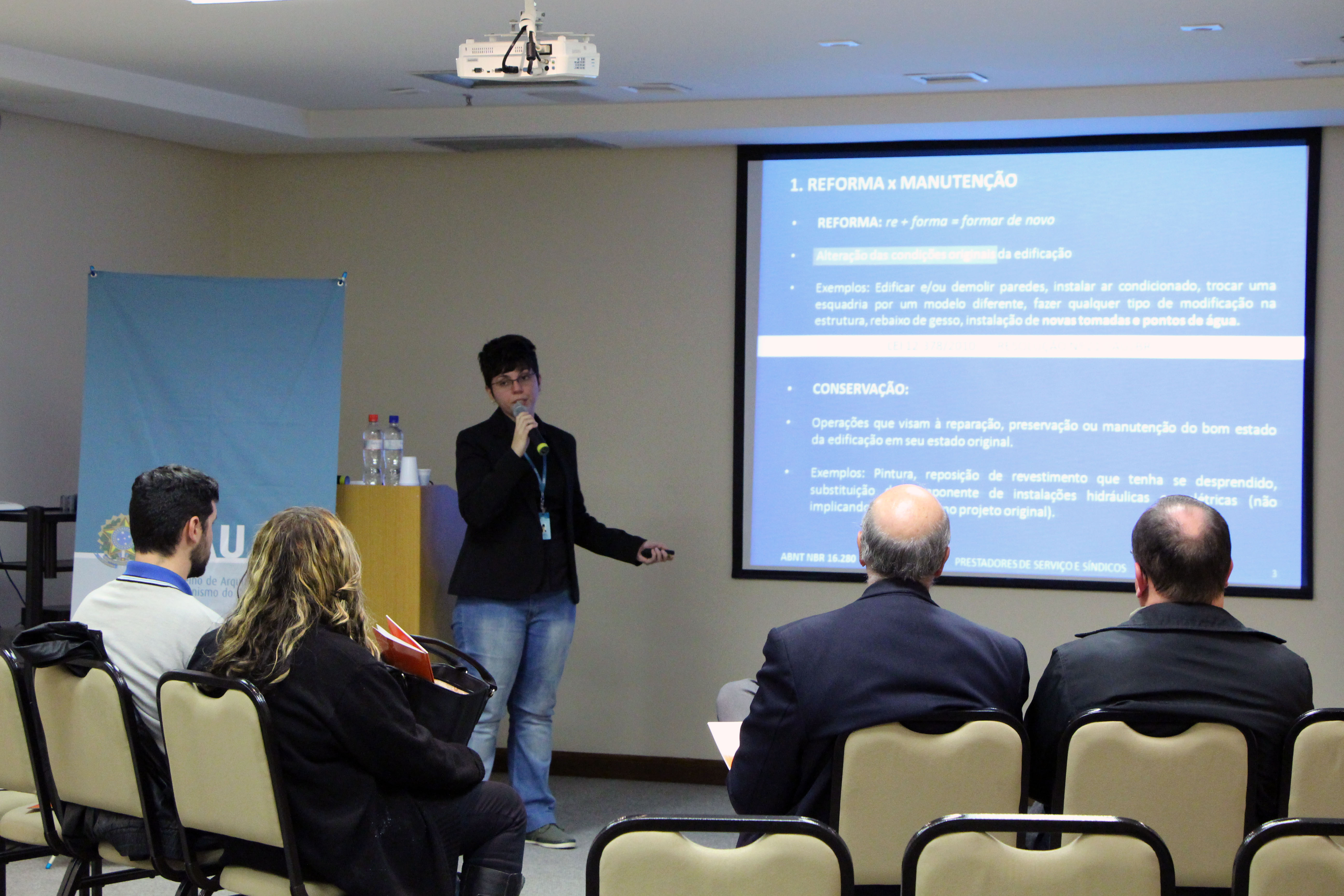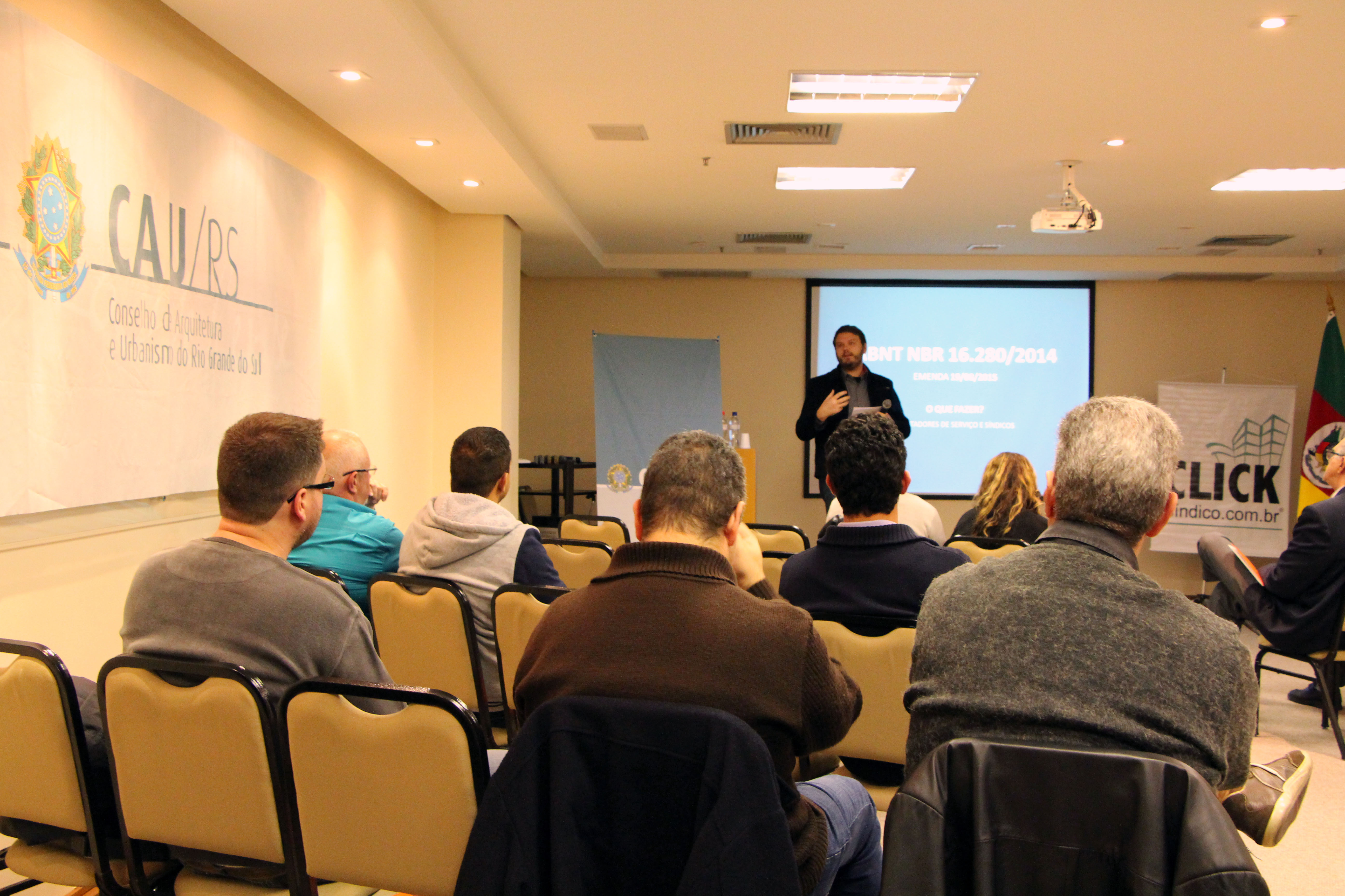 O CAU/RS recebeu quarta-feira (18/05) fornecedores e prestadores de serviços para condomínios em uma palestra sobre a NBR nº 16.280/2014 ministrada pela arquiteta e urbanista Agente de Fiscalização Andréa Pinheiro. A referida Norma Brasileira trata de reformas em edificações, sistema de gestão de reformas e requisitos. A responsabilidade e o limite da atuação do síndico e dos profissionais envolvidos em reformas foram o principal assunto abordado.