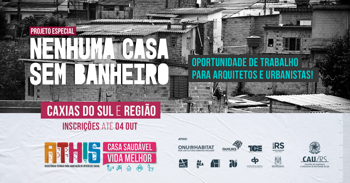 A partir deste sábado (19) até dia 04 de outubro, arquitetos e urbanistas de Caxias do Sul e região poderão realizar o credenciamento no projeto especial Nenhuma Casa sem Banheiro. Profissionais interessados ou que já tenham experiência em trabalhar com Assistência Técnica para Habitação de Interesse Social (ATHIS) podem participar da chamada pública. As inscrições devem ser realizadas via SICCAU (clique aqui e confira o passo a passo).