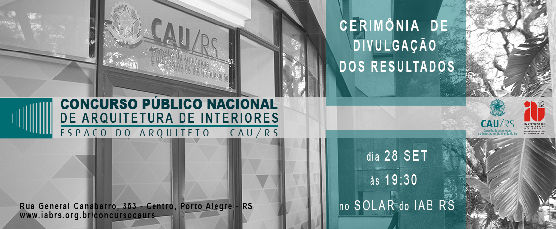 Nesta quarta-feira, dia 28 de setembro, às 19h30, ocorrerá na sede do IAB RS a Cerimônia de Divulgação dos Vencedores do Concurso Público Nacional de Arquitetura de Interiores para o Espaço do Arquiteto do Conselho de Arquitetura e Urbanismo do Rio Grande do Sul – CAU/RS, localizado em Porto Alegre. O concurso é promovido pelo Conselho de Arquitetura e Urbanismo do Rio Grande do Sul (CAU/RS) e organizado pelo Instituto de Arquitetos do Brasil (IAB RS).