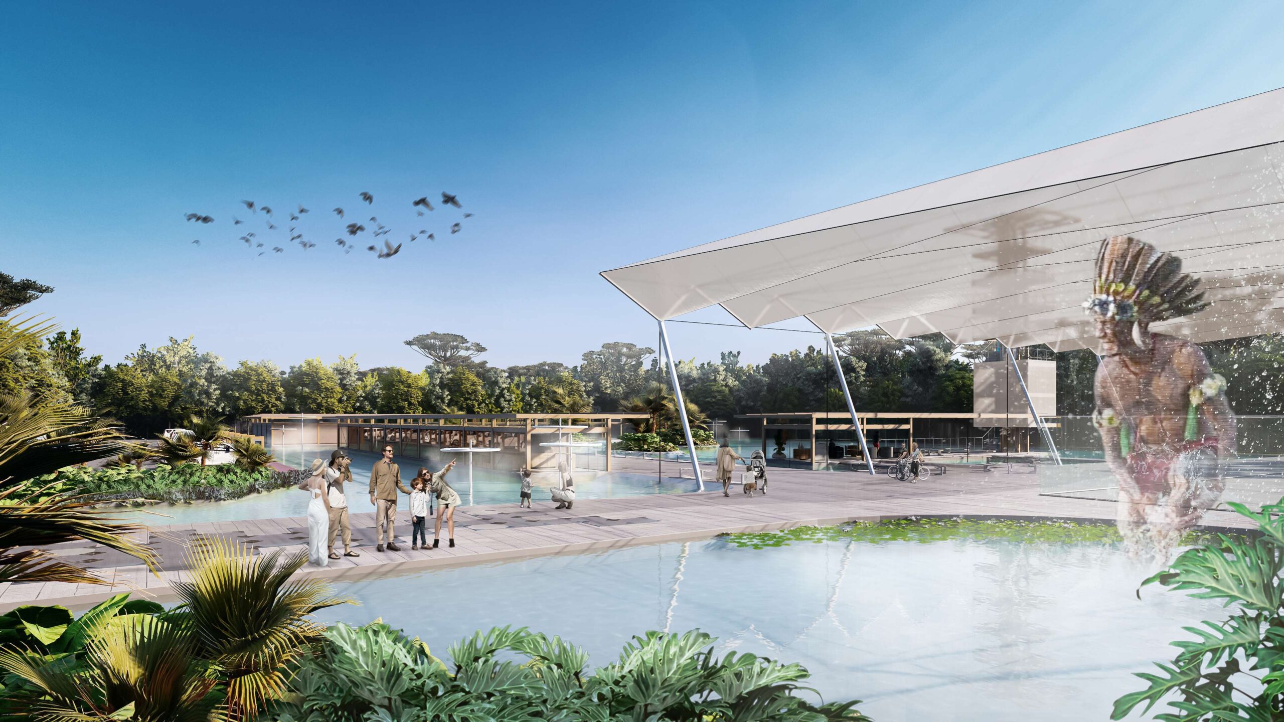 O projeto partiu da criação de ilhas em meio à água e vegetação. São pontos de uso intenso com diversas experiências físicas e digitais criando hotspots (termo empregado na ecologia com significado de áreas de máxima biodiversidade) interconectados por trilhas e passeios. As ilhas foram criadas aproveitando as áreas sem vegetação do parque. Assim, o projeto mantém intactas os maciços arbóreos existentes criando passagens conectadas em meio a vegetação local.