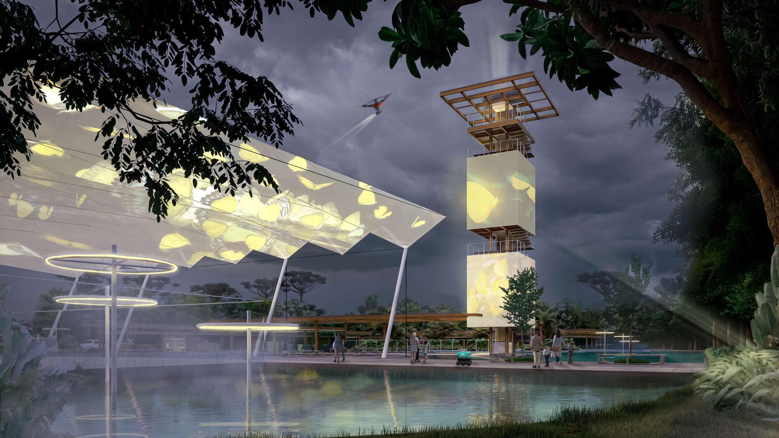 As proposições arquitetônicas deveriam estar preparadas para conter e/ou receber tecnologias, sejam elas digitais ou soluções baseadas na natureza, de forma que o EcoParque possa se tornar um laboratório de soluções 5.0. A proposta da equipe liderada por Prevedello combinou arquitetura e paisagem através de espacialidades fluídas, sistemas digitais e sistemas ecológicos diversos, capazes de proporcionar experiências e atmosferas únicas.