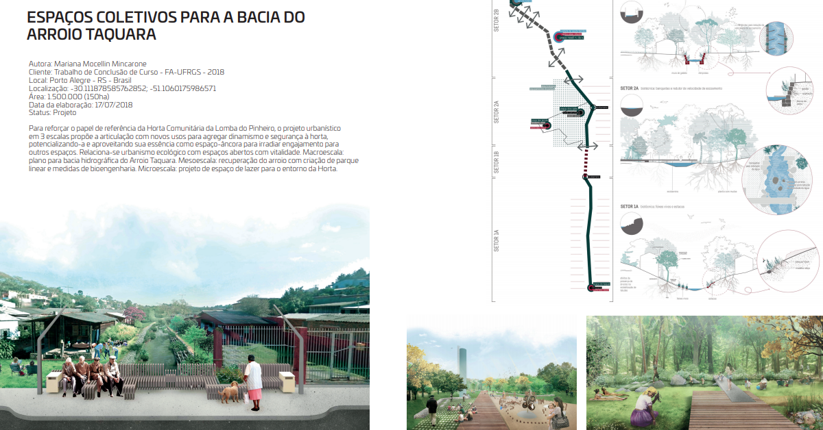 - Projeto: ESPAÇOS COLETIVOS PARA A BACIA DO ARROIO TAQUARA (Porto Alegre/RS), de Mariana Mocellin Mincarone, para o Trabalho de Conclusão de Curso na Faculdade de Arquitetura e Urbanismo da UFRGS (2018).