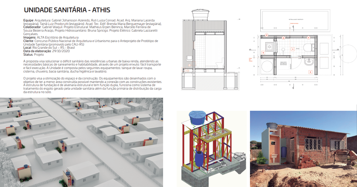 - Projeto: UNIDADE SANITÁRIA – ATHIS, de Gabriel Johansson Azeredo, um dos vencedores do Concurso Público Nacional de Arquitetura e Urbanismo para o Anteprojeto de Protótipo de Unidade Sanitária promovido pelo CAU/RS.