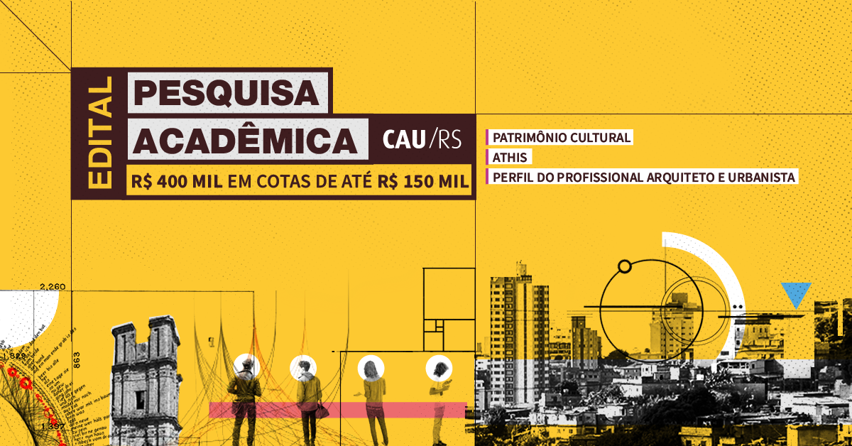 A pesquisa acadêmica é uma etapa muito importante no Ensino Superior. Além de aproximar alunos e alunas de uma extensa área de atuação profissional, a pesquisa permite contribuir de forma contínua para o ensino e formação na profissão escolhida. Sendo assim, o CAU/RS convida, por meio do Edital de Pesquisas Acadêmicas, Instituições de Ensino Superior (IES) a enviarem propostas relacionadas ao desenvolvimento da Arquitetura e Urbanismo nos eixos: (1) Patrimônio Cultural, (2) Assistência Técnica para Habitação de Interesse Social (ATHIS) e (3) Perfil do Profissional Arquiteto e Urbanista.