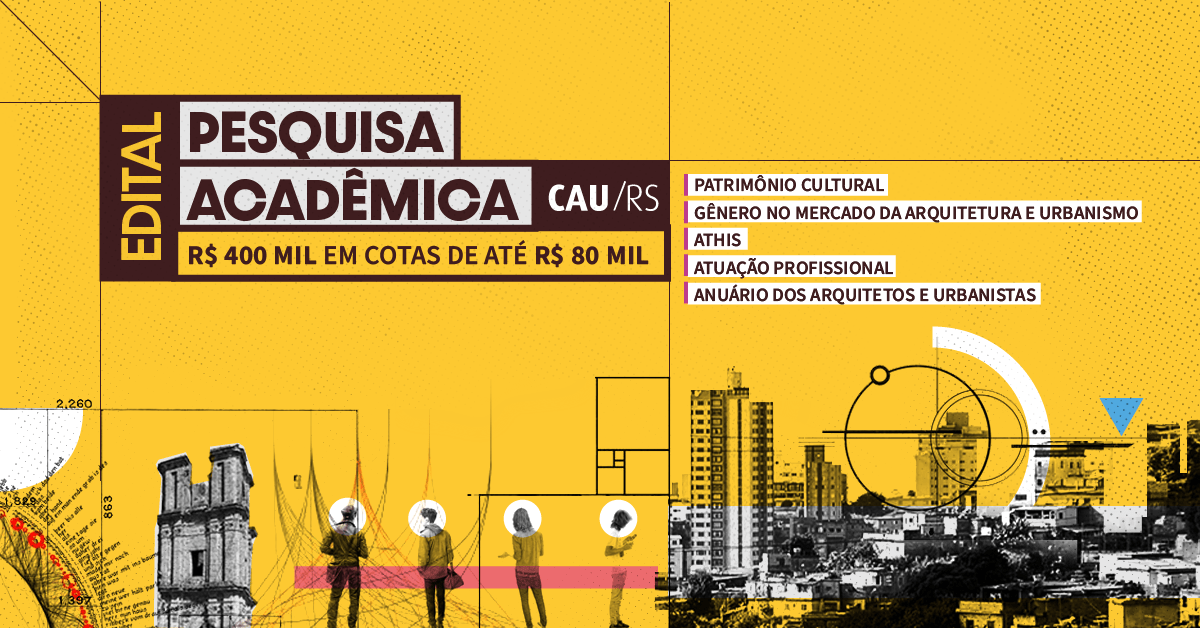 Entre os projetos estratégicos desenvolvidos pelo Conselho de Arquitetura e Urbanismo (CAU/RS) em 2021, o Edital de Pesquisas Acadêmicas convida Instituições de Ensino Superior (IES) a enviarem propostas relacionadas ao desenvolvimento da Arquitetura e Urbanismo, de interesse específico do CAU/RS. As pesquisas terão prazo de execução de 18 meses. Serão investidos R$ 400 mil em cinco cotas de até R$ 80 mil. As inscrições são online e estarão abertas de 2 de agosto até 21 de setembro. O edital já está disponível para consulta no Portal da Transparência.