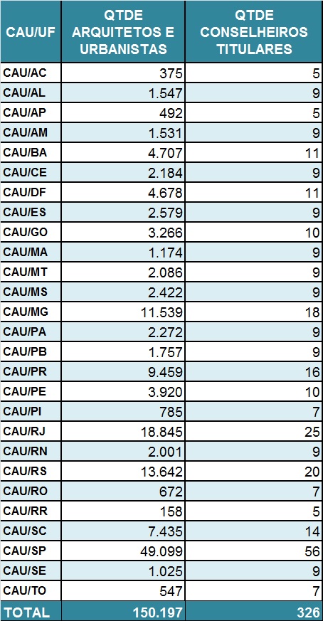 A composição dos CAU/UF seguirá o critério de proporcionalidade de votos recebido por cada chapa. Por exemplo: se um CAU/UF possui 10 vagas e duas chapas concorrendo, e uma chapa obtiver 60% dos votos e outra obtiver 40%, a primeira chapa terá direito a seis vagas de conselheiro titular e suplente, e a segunda chapa terá direito a quatro vagas – preenchidas de acordo com a ordem dos candidatos estabelecida no momento da inscrição. Assim, cada chapa sempre ocupará o número de vagas proporcional aos votos que obteve, garantindo assim a pluralidade e a diversidade de opiniões.