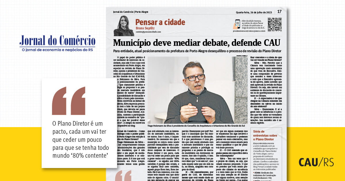 O presidente do Conselho de Arquitetura e Urbanismo (CAU/RS), Tiago Holzmann da Silva, concedeu entrevista à jornalista Bruna Suptitz, da coluna Pensar a Cidade do Jornal do Comércio. Ele destaca o papel do município na revisão do Plano Diretor e destaca o que vem ocorrendo em Porto Alegre. A entrevista foi publicada nesta quinta-feira (27/07).