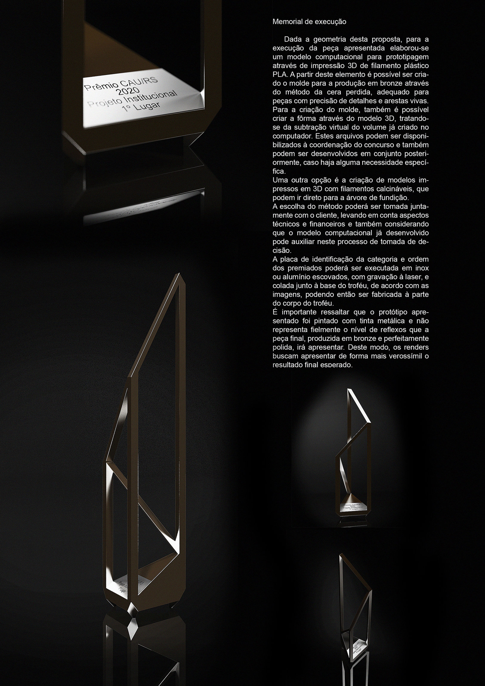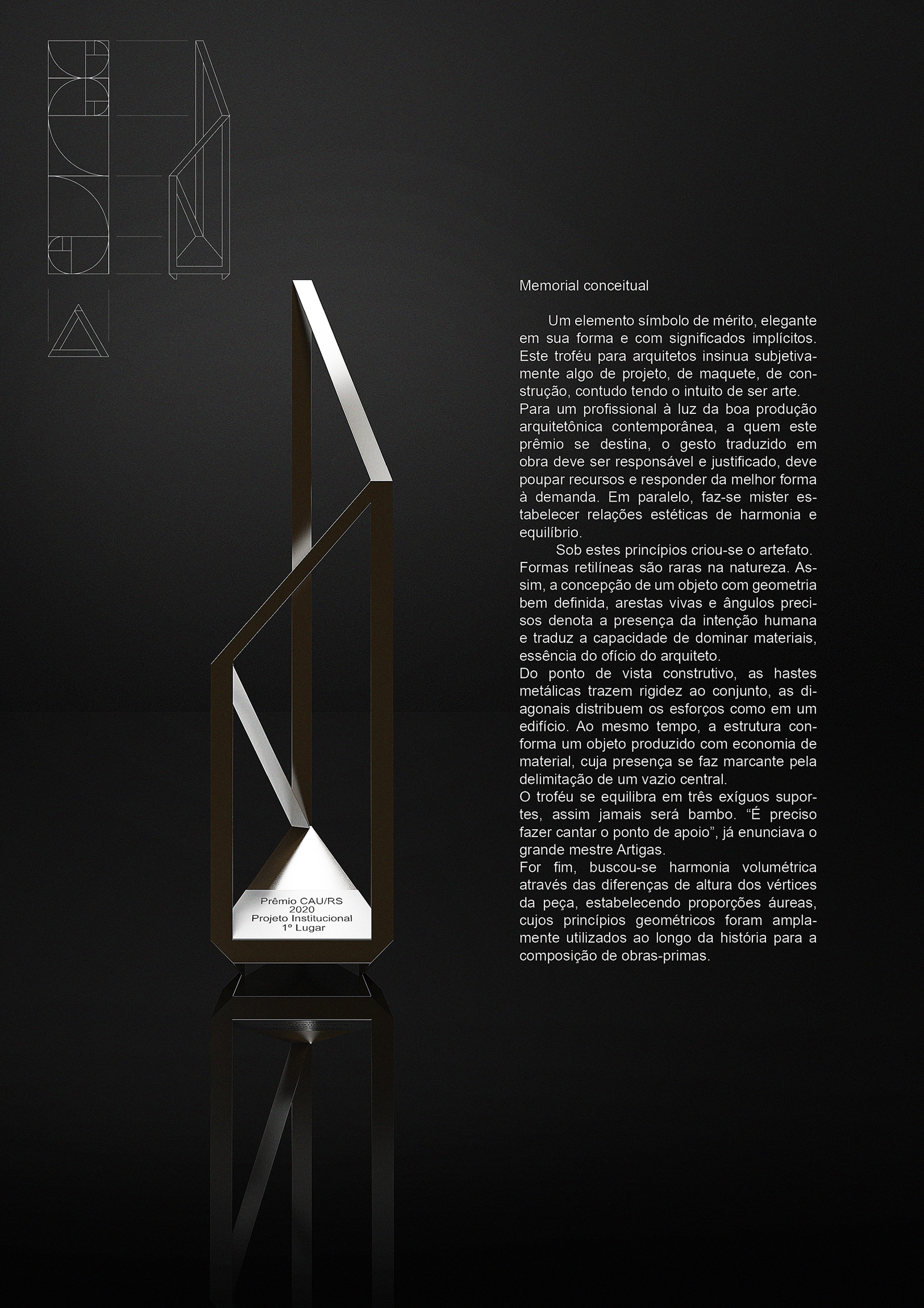 “Acreditamos que o concurso deveria ser uma forma de contratação muito mais difundida; precisamos que a sociedade saiba a função do arquiteto e urbanista. O CAU/RS é um dos que mais atua nessa linha de frente e o apoio a concursos é fundamental”, declarou Costin. Confira abaixo o memorial conceitual e de execução elaborados pelo autor do troféu.