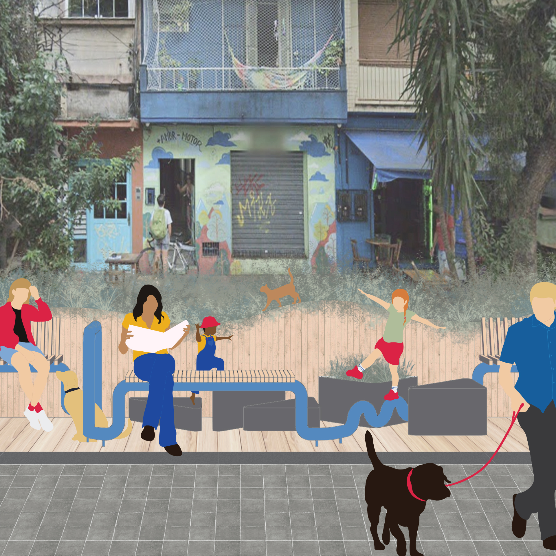 “O projeto deste parklet pode ser descrito em duas escalas: imediata e urbana. Dentro da primeira escala o projeto se ocupa de criar um equipamento de fácil construção, instalação e replicação. Seu módulo básico permite inúmeras expansões laterais, caso a rua disponha de mais espaço, além de grande adaptabilidade de funções. O parklet é constituído por um tubo colorido em alumínio que serpenteia pela estrutura de madeira, gerando três ‘espaços virtuais’ (que abrigam uma zona de 1,5 m de distanciamento entre eles), além dos equipamentos que o compõe. Estes equipamentos são classificados como ‘básicos’ (lixeira, bicicletário, bancos, floreiras e um poste de controle e iluminação), que estão presentes em todos os parklets, e ‘tipos’ que podem ser encomendados visando a melhor implantação possível em relação ao seu contexto (estar, academia, playground ou multifuncional)”, destaca.