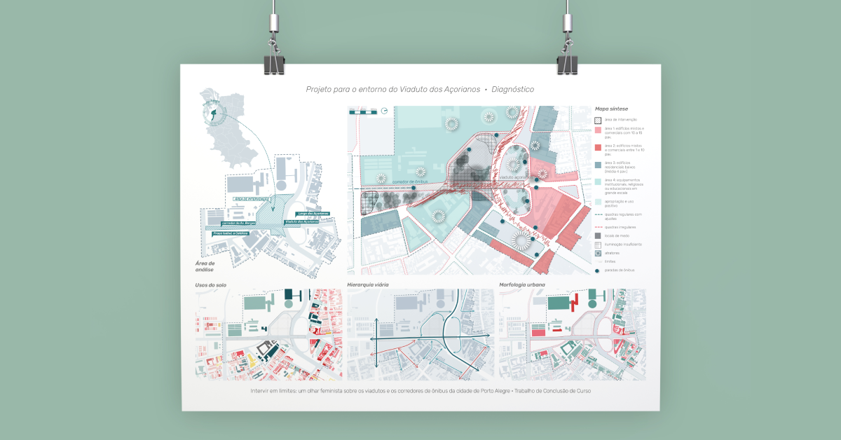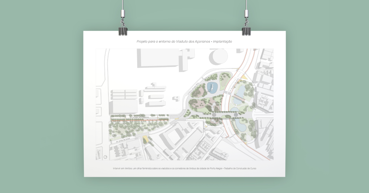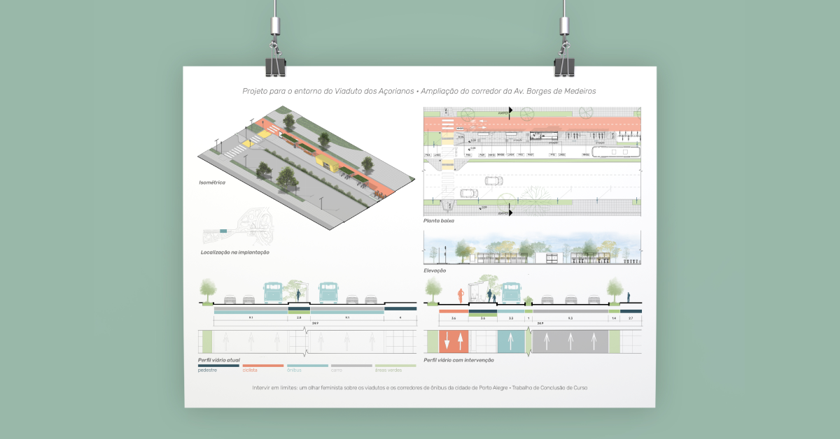 Já o trabalho de Ana Clara Menuzzi aborda a cidade através de uma perspectiva de gênero. Ela estudou os corredores de ônibus e viadutos da cidade de Porto Alegre e propôs um Plano de Qualificação para essas estruturas. Em sua pesquisa, Ana Clara averiguou que esses objetos reforçam a desigualdade de gênero, pois seu planejamento foi historicamente conduzido por homens, que não levam em conta as demandas femininas. “As mulheres são as mais afetadas pela insegurança urbana. Mentalmente separamos os locais seguros daqueles a evitar, pois somos ensinadas que qualquer violência que sofrermos será justificada por nossa ‘imprudência’”, salienta.