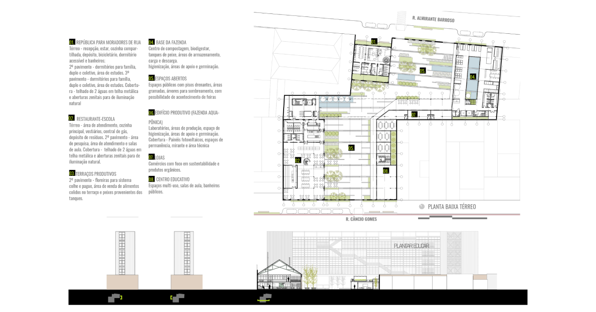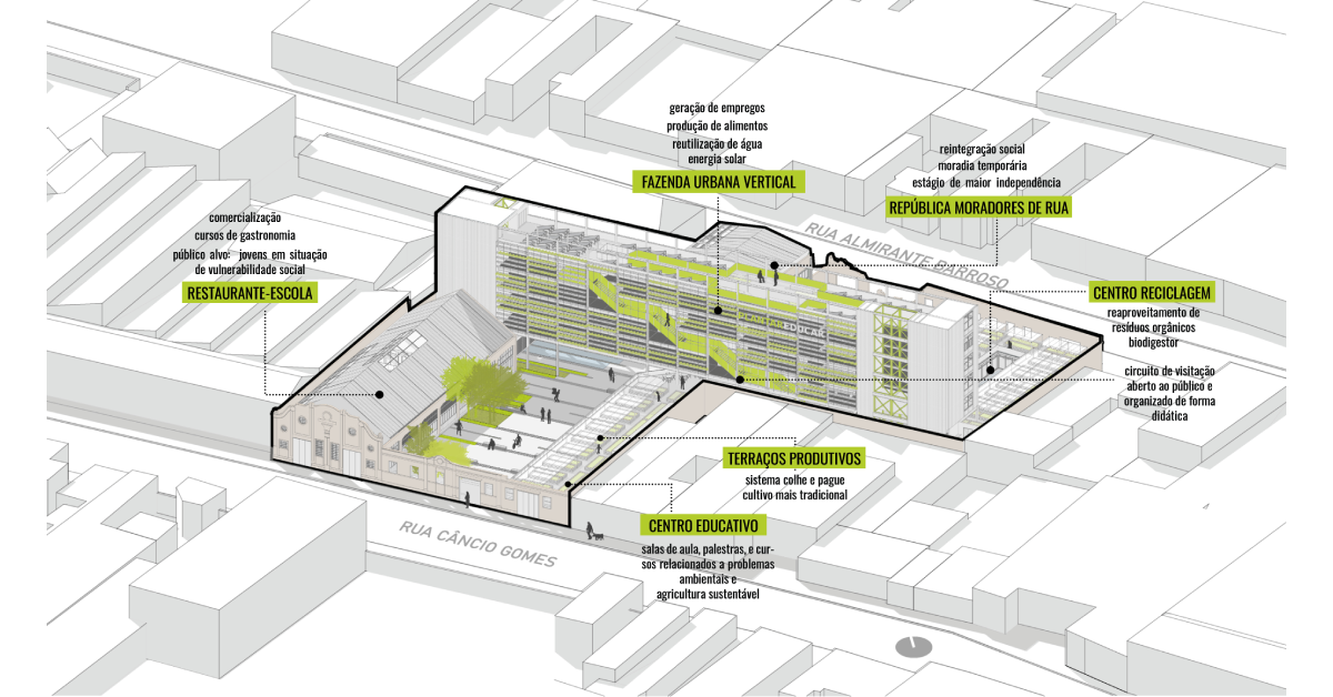 Os trabalhos premiados pelo ArchDaily abordaram, entre outros aspectos, o impacto social da Arquitetura e Urbanismo. O projeto de Yasmin Jaskulski apresenta um ideal de futuro sustentável e inclusivo, combinando usos voltados à produção de alimentos, à educação e à reintegração social de pessoas em situação de vulnerabilidade social.