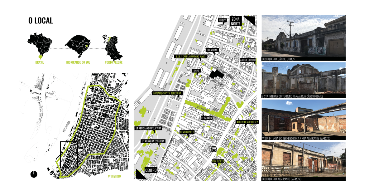 Sua proposta está inserida no 4º Distrito de Porto Alegre, localização que apresenta diversas edificações subutilizadas e abriga a segunda região da cidade com mais pessoas em situação de rua. A ideia era utilizar tecnologias de Agricultura Urbana e o próprio edifício como espaço educativo por meio da criação de circuitos de visitação, um centro de compostagem aberto à comunidade, espaços de comercialização e áreas abertas qualificadas. “Apesar de ter um aspecto de degradação e abandono, o 4D representa um espaço latente por transformação. As edificações podem ter impactos menores no meio ambiente e tornar isso de domínio público, aproximando o complexo das escolas e do público em geral”, comenta.