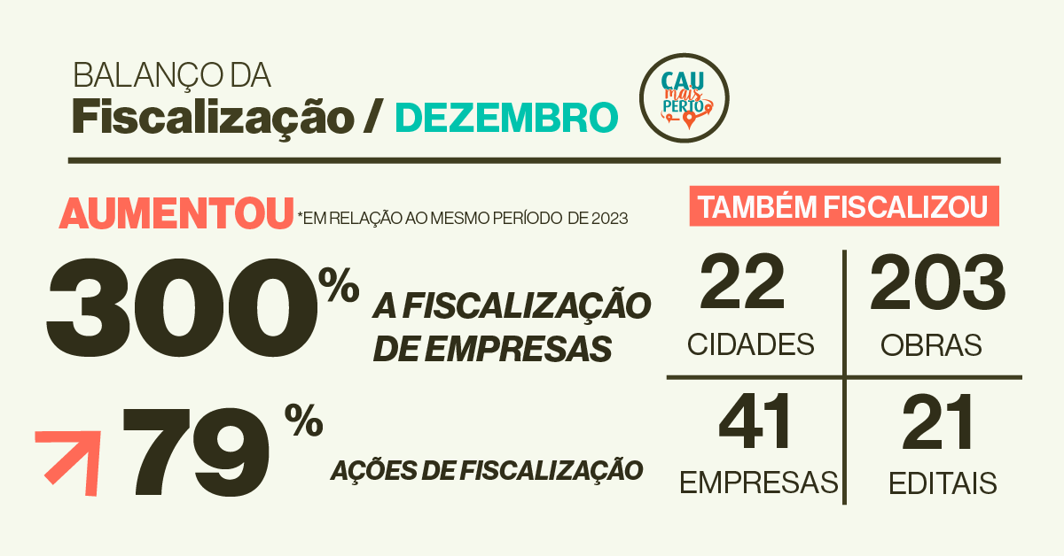 O mês de dezembro também apresentou crescimento, se comparado a dezembro de 2023. As 335 ações de fiscalização (Dez/2024), representaram um aumento de 79%, similar ao aumento no número de obras fiscalizadas, que foi de 77%. O número que cresceu exponencialmente no mês de dezembro foi o de fiscalização de empresas, que aumentou 300% em relação ao mesmo período de 2023