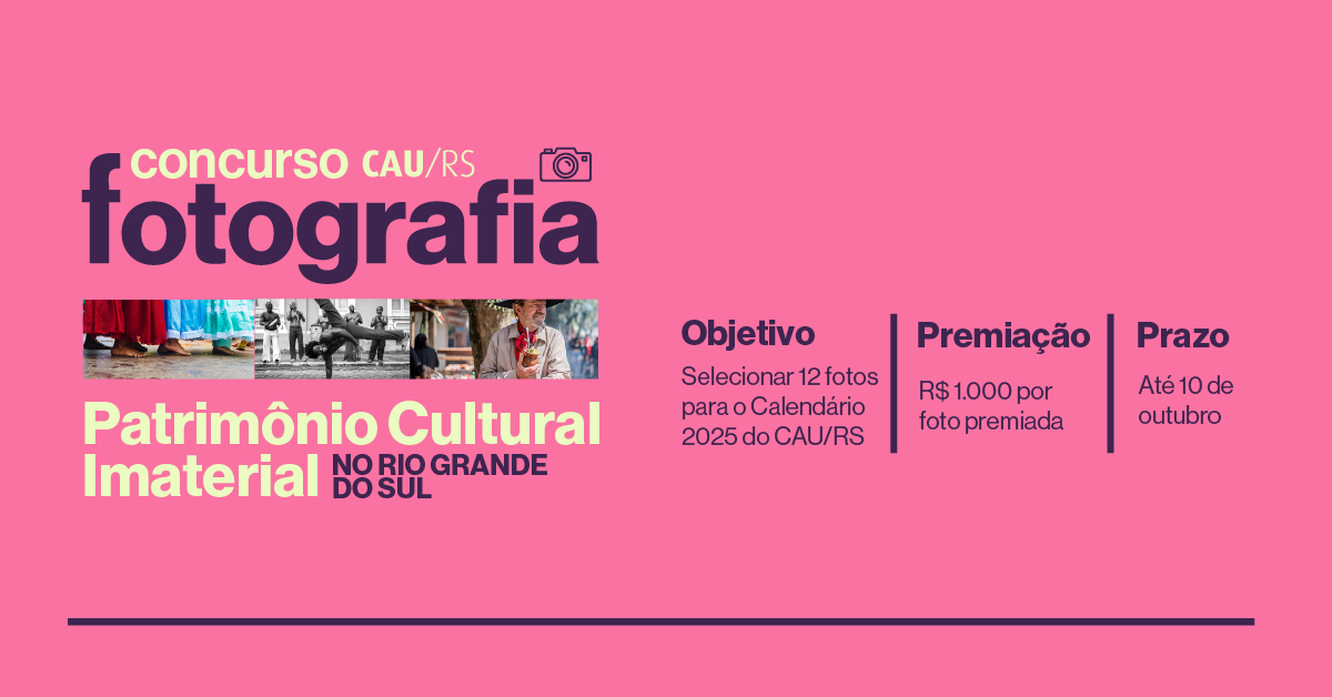As doze imagens selecionadas deverão compor o calendário oficial 2025 do CAU/RS e também poderão ser utilizadas em materiais institucionais, como campanhas, exposições e nos canais de comunicação do CAU/RS. Os autores e autoras de cada foto serão premiados com R$ 1 mil em dinheiro.