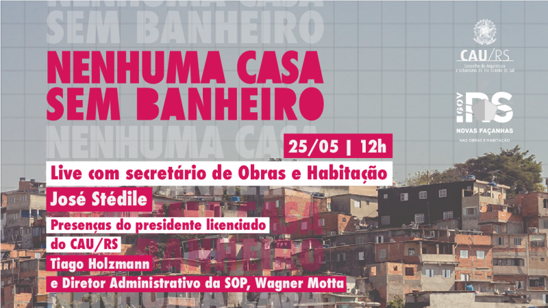 O projeto especial Nenhuma Casa sem Banheiro é uma iniciativa do Conselho de Arquitetura e Urbanismo (CAU/RS), cuja implementação no Rio Grande do Sul conta com apoio da Secretaria de Obras e Habitação (SOP). Na próxima terça-feira, dia 25, às 12h, a SOP realiza uma live em que abordará os detalhes finais para dar início ao projeto na Região Metropolitana de Porto Alegre.