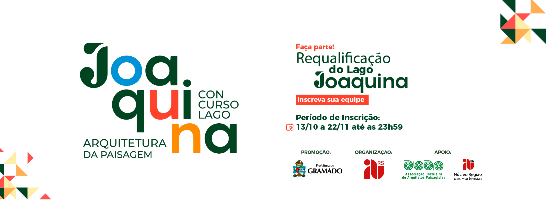A Prefeitura de Gramado (RS) lançou o edital do concurso público de Arquitetura e Urbanismo que tem como objetivo selecionar as melhores propostas para a requalificação do entorno do Lago Joaquina Rita Bier. As bases do concurso estão disponíveis no site www.concursolagojoaquina.org.br. As inscrições ficam abertas até 22 de novembro e o período de entrega das propostas é de 20/11 a 04/12/2023.