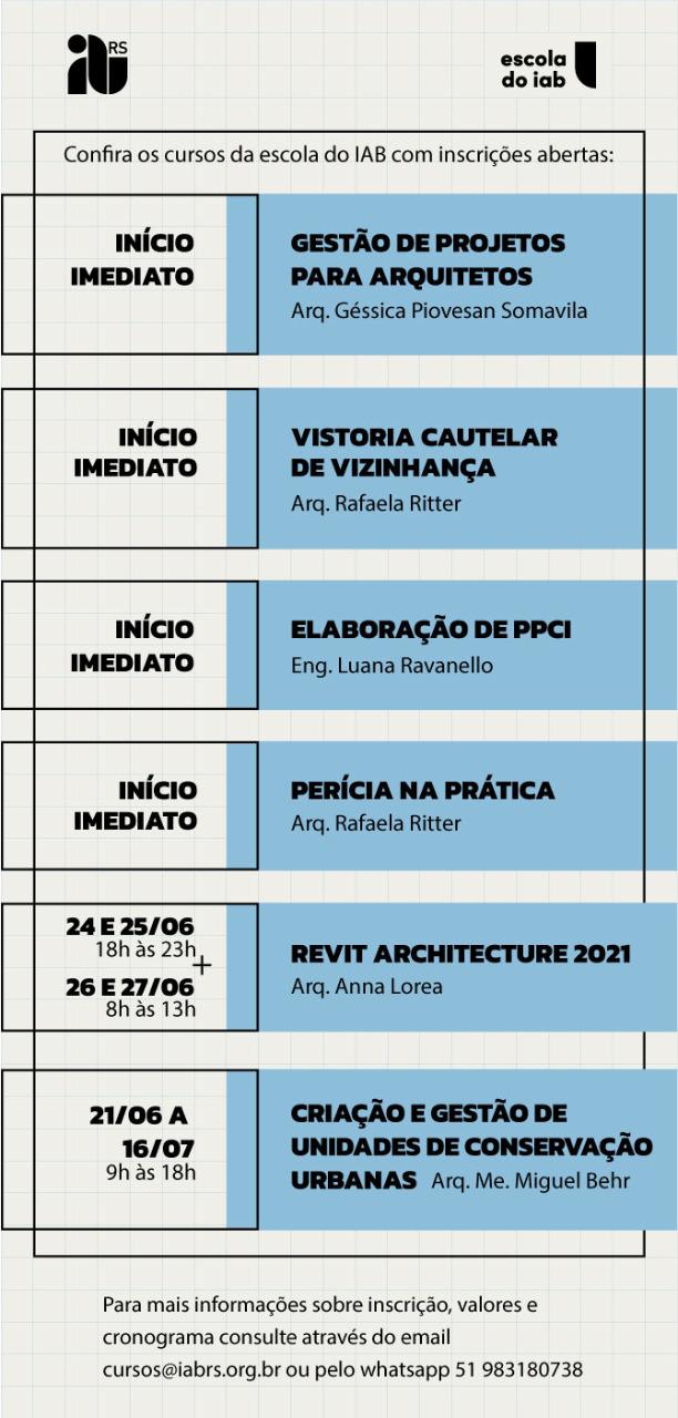 O Instituto de Arquitetos do Brasil (IAB RS) está oferecendo cursos online para profissionais de Arquitetura e Urbanismo. As inscrições devem ser feitas pelo site escolaiabrs.org.br. Em caso de dúvidas ou precisando de mais informações, entre em contato pelo e-mail cursos@iabrs.org.br ou pelos telefones: (51) 98318-0738 e (51) 3212-2552.