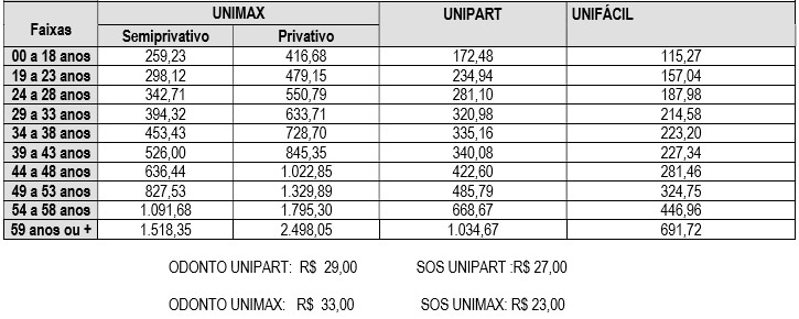 Confira a tabela de valores atualizada: