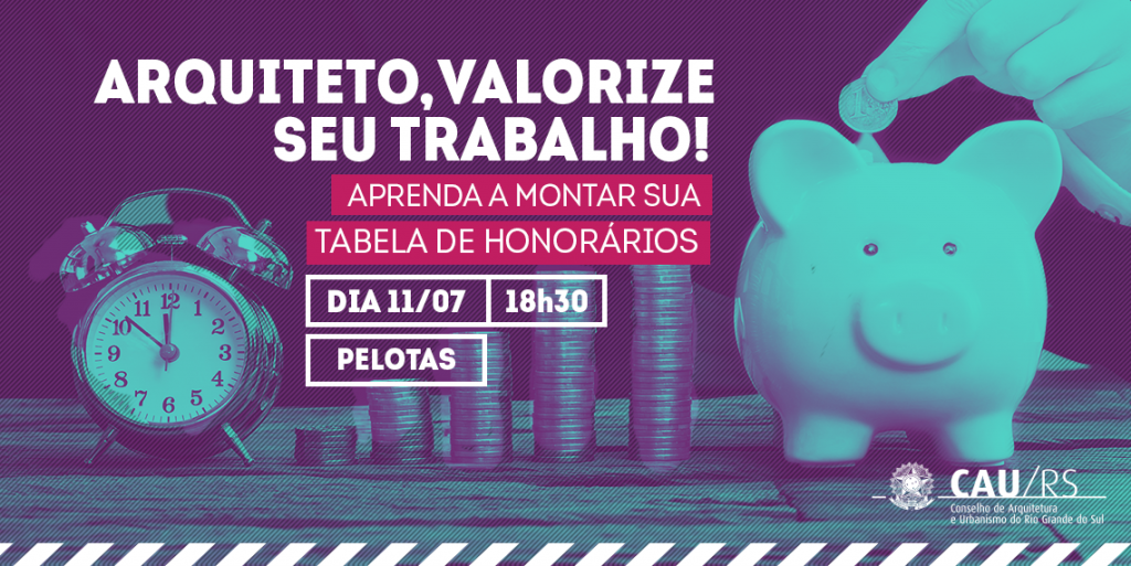 Arquiteto e urbanista, quanto vale o seu trabalho? No dia 11 de julho, às 18h30, o Conselho de Arquitetura e Urbanismo (CAU/RS) promoverá no Hotel Jacques Georges Tower, em Pelotas, uma palestra para profissionais e estudantes da área sobre a Tabela de Honorários de Serviços de Arquitetura e Urbanismo. O evento é gratuito para todos os públicos e as inscrições estão abertas no Sympla: http://bit.ly/2RKtra1.
