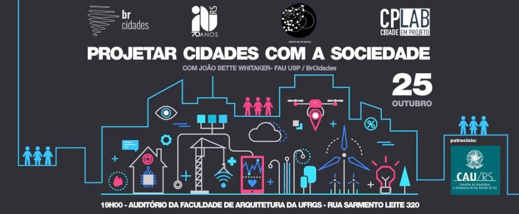 O Instituto de Arquitetos do Brasil (IAB RS), o BR Cidades – Núcleo Porto Alegre; o Cidade em Projeto – Laboratório de Ensino, Pesquisa e Extensão (CPLAB) e o Grupo de Pesquisa Sociologia Urbana e Internacionalização das cidades (GPSUIC) promovem nessa quinta-feira (25/10), às 19h, no Auditório da Faculdade de Arquitetura da UFRGS, a palestra “Projetar Cidades com a Sociedade”, ministrada pelo arquiteto e urbanista João Sette Whitaker, integrante do projeto BR CIDADES. O evento é gratuito e tem patrocínio do Conselho de Arquitetura e Urbanismo (CAU/RS).